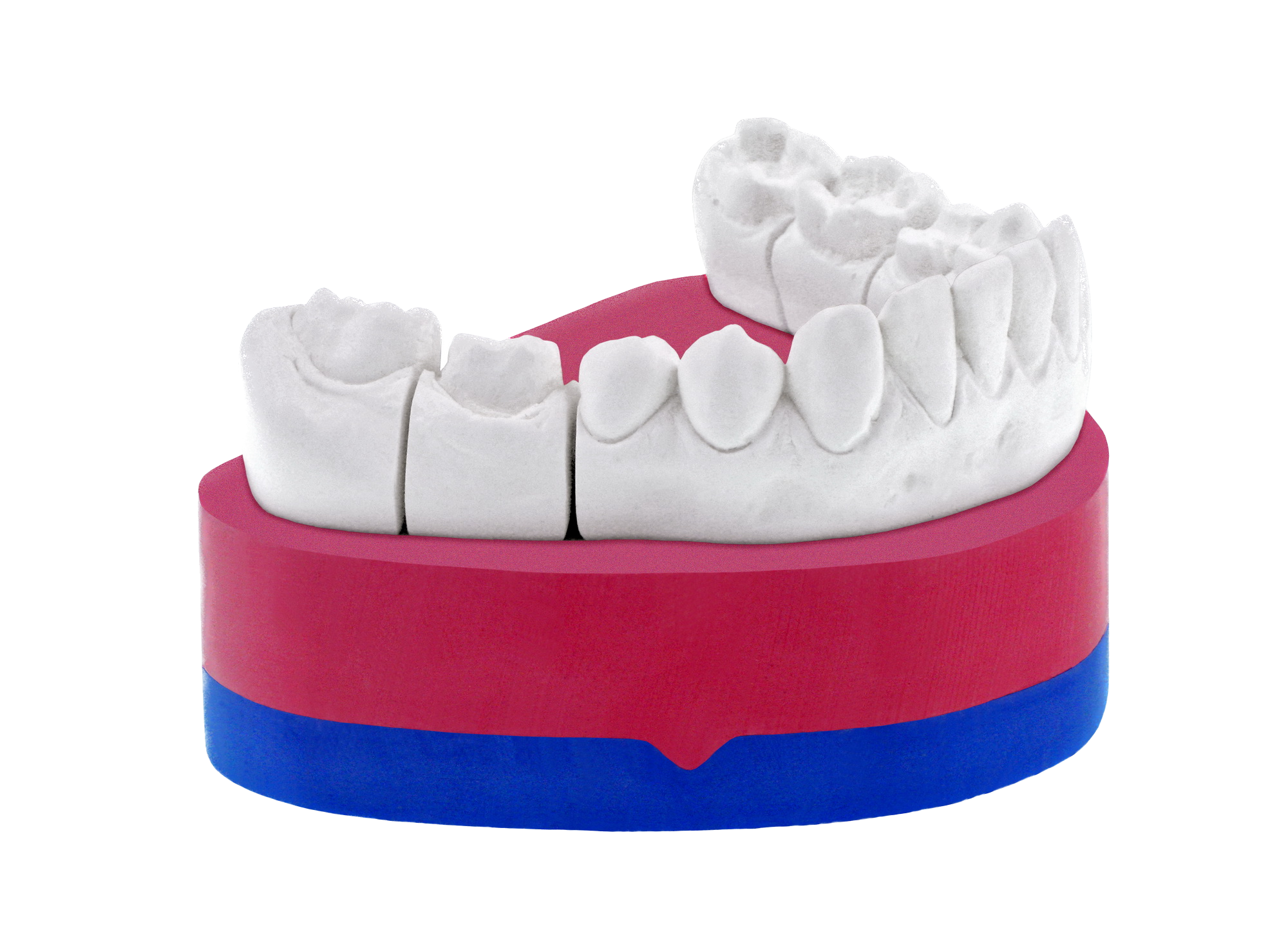 With this highly accurate split-cast system, the technician achieves an exact placing and remounting of the model into the articulator. This system can be used most common pin drill machines by just exchanging the drill bit. The small pin size allows placing of 2 pins even on small lower anterior sections.